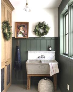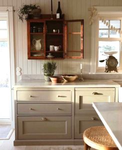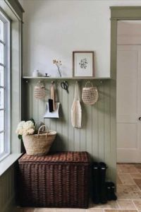 El estilo shaker conocido por su funcionalidad, sencillez y austeridad sí que incorpora algunos elementos decorativos sencillos que aportan calidez y vida al ambiente. Cuadros con marcos de madera sencillos con motivos botánicos, ganchos de pared para colgar utensilios, bolsos, etc., para mantener el orden vajilla, jarrones de cerámica artesanal en blanco…